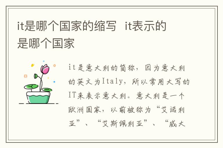 it是意大利的简称,因为意大利的英文为Italy,所以常用大写的IT来表示意大利。意大利是一个欧洲国家,以前被称为“艾诺利亚”、“艾斯佩利亚”、“威大利亚”,后来是因为语言的变化才称为“意大利亚”的,其含义为“小牛生长的乐园”。