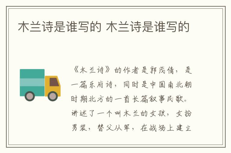 《木兰诗》的作者是郭茂倩,是一篇乐府诗,同时是中国南北朝时期北方的一首长篇叙事民歌。讲述了一个叫木兰的女孩,女扮男装,替父从军,在战场上建立功勋,回朝后不愿作官,只求回家团聚的故事,热情赞扬了这位女子勇敢善良的品质、保家卫国的热情和英勇无畏的精神。