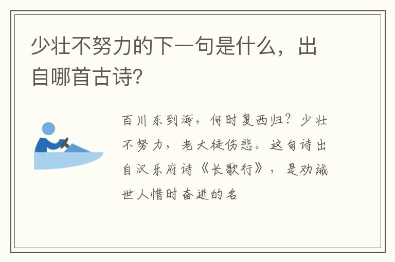 百川东到海,何时复西归?少壮不努力,老大徒伤悲。这句诗出自汉乐府诗《长歌行》,是劝诫世人惜时奋进的名篇。