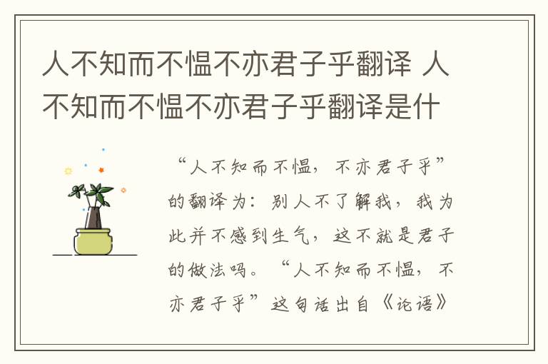 “人不知而不愠,不亦君子乎”的翻译为:别人不了解我,我为此并不感到生气,这不就是君子的做法吗。“人不知而不愠,不亦君子乎”这句话出自《论语》,节选原文为:子曰:“学而时习之,不亦说乎?有朋自远方来,不亦乐乎?人不知,而不愠,不亦君子乎?”