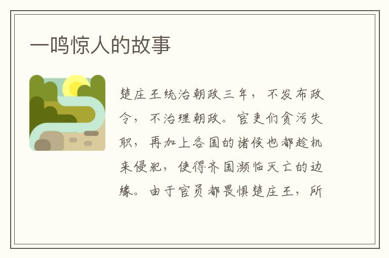 有一天,右司马来到君王座驾旁说:“有鸟止南方之阜,三年不翅,不飞不鸣,默然无声,此为何名”,楚庄王听懂了说:“三年不翅,将以长羽翼;不飞不鸣,将以观民则”。从此齐威王不在沈迷于饮酒作乐,而开始整顿国政。他召见全国的官吏,奖励忠臣,惩治贪官污吏。结果全国就振作起来,到处充满蓬勃的朝气。楚庄王带兵讨伐齐国,在宋国汇合诸侯,终于使楚国称霸天下。