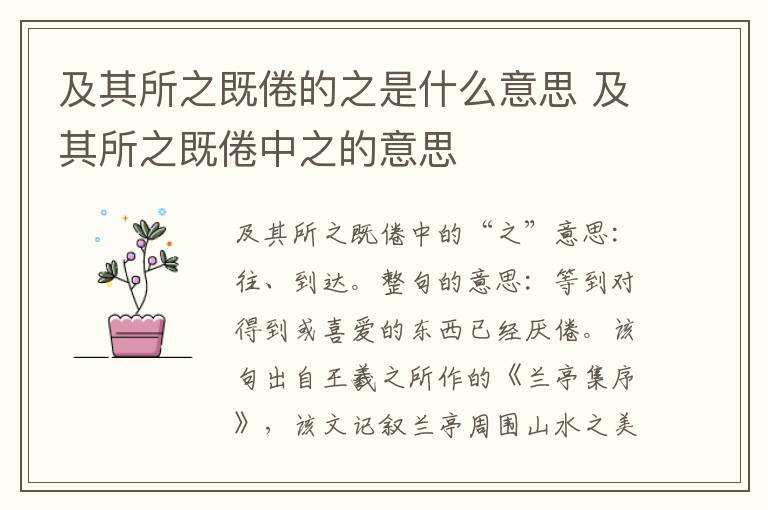 及其所之既倦中的“之”意思:往、到达。整句的意思:等到对得到或喜爱的东西已经厌倦。该句出自王羲之所作的《兰亭集序》,该文记叙兰亭周围山水之美和聚会的欢乐之情,抒发作者对于生死无常的感慨。