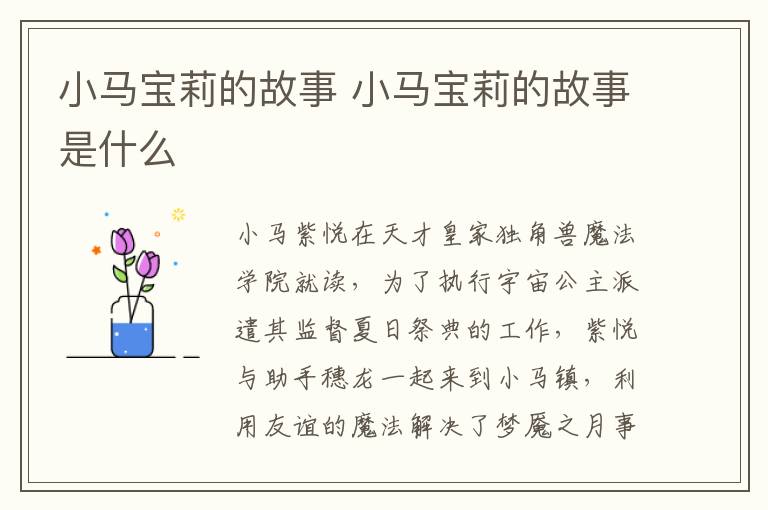 《小马宝莉》的故事:小马紫悦在天才皇家独角兽魔法学院就读,为了执行宇宙公主派遣其监督夏日祭典的工作,紫悦与助手穗龙一起来到小马镇,利用友谊的魔法解决了梦魇之月事件;在这期间,小马紫悦她结识了五位好朋友,并获得了真正的友谊;最后,小马紫悦接受宇宙公主的指示,留在小马谷,与朋友们共同守护小马利亚。