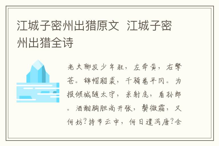 江城子密州出猎原文 江城子密州出猎全诗 知识分享 7月9日 编辑 童画 取消关注 关注 私信 《江城子·密州出猎》 宋·苏轼 老夫聊发少年狂,左牵黄,右擎苍。锦帽貂裘,千骑卷平冈。为报倾城随太守,亲射虎,看孙郎。 酒酣胸胆尚开张,鬓微霜,又何妨?持节云中,何日遣冯唐?会挽雕弓如满月,西北望,射天狼。 No related posts. 本文内容由互联网用户自发贡献,该文观点仅代表作者本人。本站仅提供信息存储空间服务,不拥有所有权,不承担相关法律责任。如发现本站有涉嫌抄袭侵权/违法违规的内容, 请发送邮件至 2245678901@qq.com 举报,一经查实,本站将立刻删除。 给TA打赏 共{{data.count}}人 人已打赏