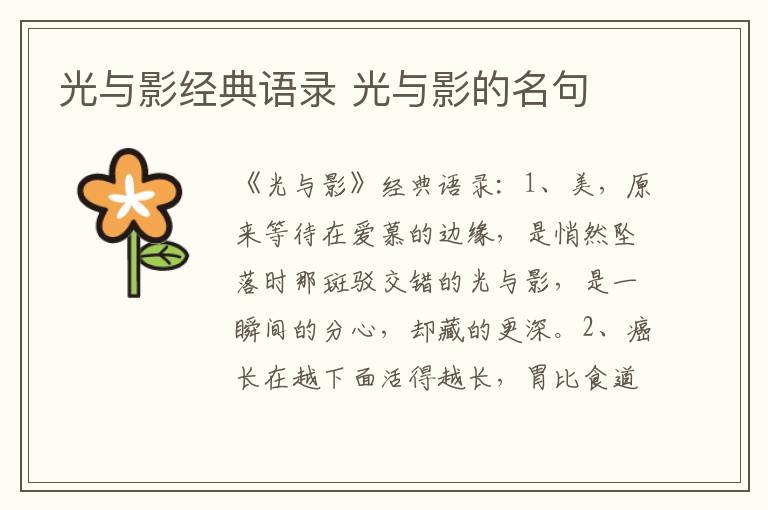 《光与影》经典语录:1、美,原来等待在爱慕的边缘,是悄然坠落时那斑驳交错的光与影,是一瞬间的分心,却藏的更深。2、癌长在越下面活得越长,胃比食道长,肠比胃长。3、你向着光,我倒成了你的影子。4、每个孩子天生都有很多幻觉,这幻觉和光与影,和想象的空间,甚至和身体状态都有关系。孩子长大后,多半都会忘了,时间,社会习俗,知识系统强迫他们忘却,似乎那是进入成人世界的条件。