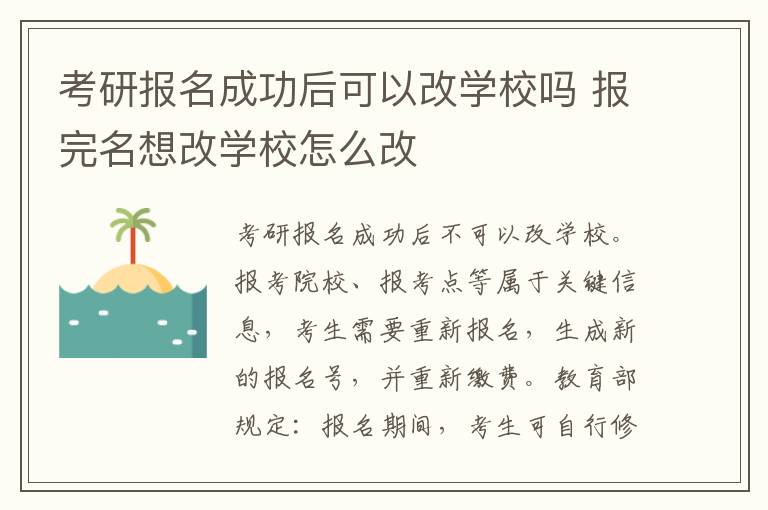 考研报名成功后不可以改学校。报考院校、报考点等属于关键信息,考生需要重新报名,生成新的报名号,并重新缴费。教育部规定:报名期间,考生可自行修改网上报名信息或重新填报报名信息,但一位考生只能保留一条有效报名信息。逾期不再补报,也不得修改报名信息。