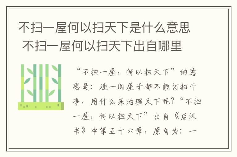“不扫一屋,何以扫天下”的意思是:连一间屋子都不能打扫干净,用什么来治理天下呢?“不扫一屋,何以扫天下”出自《后汉书》中第五十六章,原句为:一室之不治,何以天下家国为?