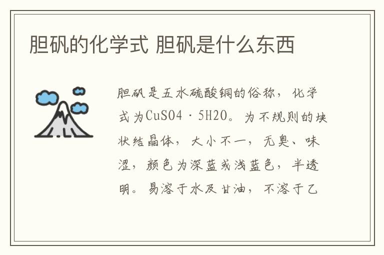 胆矾是五水硫酸铜的俗称,化学式为CuSO?·5H?O。为不规则的块状结晶体,大小不一,无臭、味涩,颜色为深蓝或浅蓝色,半透明。易溶于水及甘油,不溶于乙醇,水溶液显铜盐及硫酸盐的各种特殊反应。露置在干燥空气中会缓缓风化,加热会失去结晶水变成白色,遇水则又变蓝色。