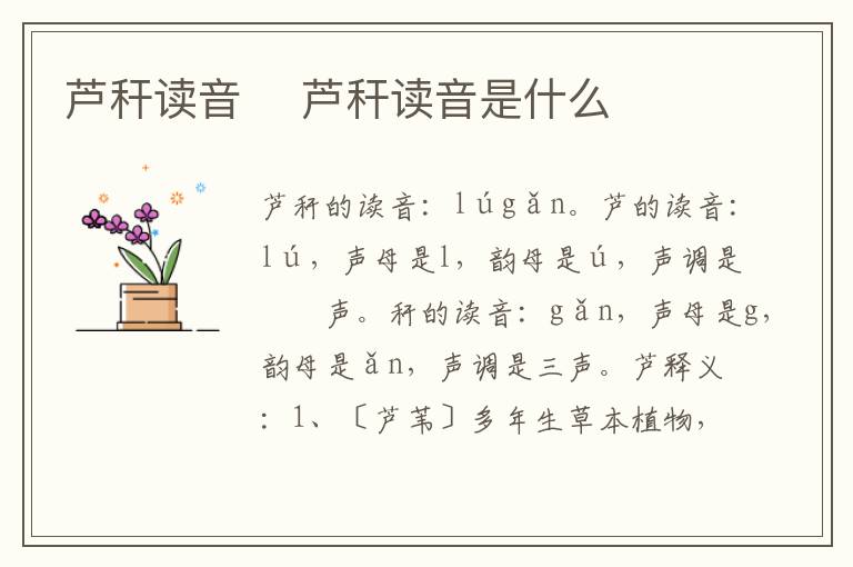 芦秆的读音:lúgǎn。芦的读音:lú,声母是l,韵母是ú,声调是二声。秆的读音:gǎn,声母是g,韵母是ǎn,声调是三声。芦释义:1、〔芦苇〕多年生草本植物,多生于水边,茎中空,茎可编席,亦可造纸。2、姓。秆释义:稻麦等植物的茎。