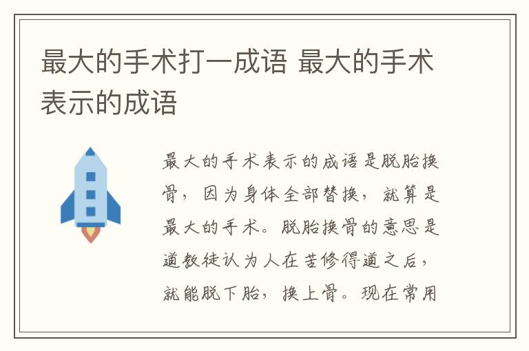 最大的手术表示的成语是脱胎换骨,因为身体全部替换,就算是最大的手术。脱胎换骨的意思是道教徒认为人在苦修得道之后,就能脱下胎,换上骨。现在常用来比喻痛改前非,重新做人