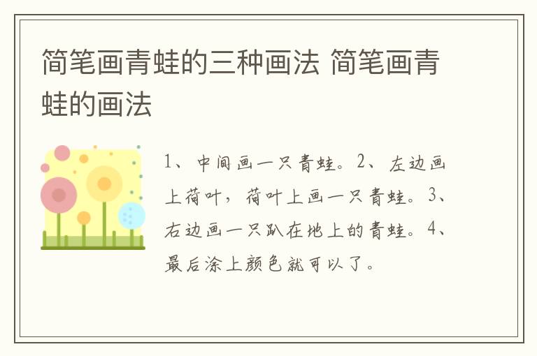 简笔画青蛙的三种画法 简笔画青蛙的画法 知识分享 7月10日 编辑 童画 取消关注 关注 私信 1、中间画一只青蛙。 2、左边画上荷叶,荷叶上画一只青蛙。 3、右边画一只趴在地上的青蛙。 4、最后涂上颜色就可以了。 No related posts. 本文内容由互联网用户自发贡献,该文观点仅代表作者本人。本站仅提供信息存储空间服务,不拥有所有权,不承担相关法律责任。如发现本站有涉嫌抄袭侵权/违法违规的内容, 请发送邮件至 2245678901@qq.com 举报,一经查实,本站将立刻删除。 给TA打赏 共{{data.count}}人 人已打赏