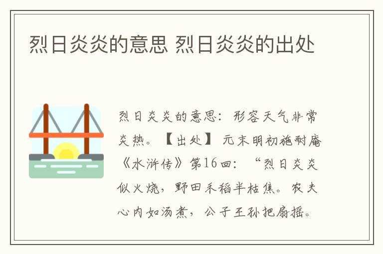 【出处】 元末明初施耐庵《水浒传》第16回:“烈日炎炎似火烧,野田禾稻半枯焦。农夫心内如汤煮,公子王孙把扇摇。”