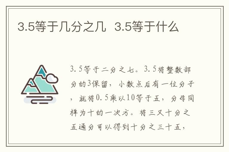 3.5将整数部分的3保留,小数点后有一位分子,就将0.5乘以10等于五,分母同样为十的一次方。将三又十分之五通分可以得到十分之三十五,将十分之三十五化简可以得到最终结果二分之七。