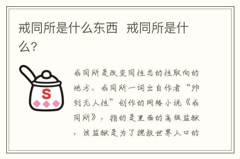 戒同所是改变同性恋的性取向的地方。戒同所一词出自作者“帅到无人性”创作的网络小说《戒同所》,指的是里面的高级监狱,该监狱是为了挽救世界人口的发育而建立。该小说讲述了由于同性恋的比例增高,为了挽救世界人口的发育,2024年,国家成立了戒同所。据说,从戒同所里出来的人无一例外全部成了正宗的异性恋。