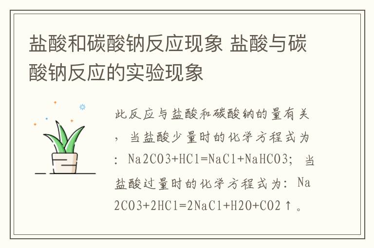 盐酸加入碳酸钠,一开始没有气泡,随着加入的量变多,开始有气体放出。碳酸钠和盐酸的反应现象并不是一成不变的,主要取决于这两种物质的其中一种的含量,含量不同,反应现象也不同。