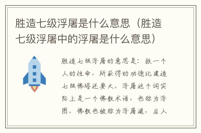 胜造七级浮屠的意思是:救一个人的性命,所获得的功德比建造七级佛塔还要大。浮屠这个词实际上是一个佛教术语,也称为浮图。佛教也被称为浮屠道,后人简化为佛。建造一座七级宝塔就像供奉一尊100英尺高的佛像,救人一命胜造七级浮屠,它的功德比你建造一座七层佛塔还要大,只有德高望重的高僧才有资格在死后建造佛塔。
