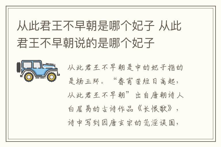 从此君王不早朝是中的妃子指的是杨玉环。“春宵苦短日高起,从此君王不早朝”出自唐朝诗人白居易的古诗作品《长恨歌》,诗中写到因唐玄宗的荒淫误国,引出了政治上“安史之乱”等的系列悲剧,反过来又导致了他和杨贵妃的爱情悲剧。