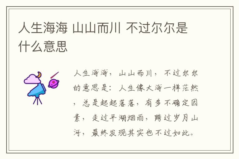 人生海海,山山而川,不过尔尔的意思是:人生像大海一样茫然,总是起起落落,有多不确定因素,走过平湖烟雨,跨过岁月山河,最终发现其实也不过如此。这是一句闽南语,出自麦家时隔8年之后的首部长篇之作《人生海海》。