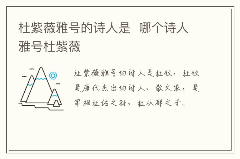 杜紫薇雅号的诗人是 哪个诗人雅号杜紫薇 知识分享 7月14日 编辑 童画 取消关注 关注 私信 杜紫薇雅号的诗人是杜牧,杜牧是唐代杰出的诗人、散文家,是宰相杜佑之孙,杜从郁之子。 因晚年居长安南樊川别墅,故后世称“杜樊川”,著有《樊川文集》。杜牧的诗歌以七言绝句著称,内容以咏史抒怀为主,其诗英发俊爽,多切经世之物,在晚唐成就颇高。杜牧人称“小杜”,以别于杜甫,"大杜“。与李商隐并称“小李杜”。 No related posts. 本文内容由互联网用户自发贡献,该文观点仅代表作者本人。本站仅提供信息存储空间服务,不拥有所有权,不承担相关法律责任。如发现本站有涉嫌抄袭侵权/违法违规的内容, 请发送邮件至 2245678901@qq.com 举报,一经查实,本站将立刻删除。 给TA打赏 共{{data.count}}人 人已打赏