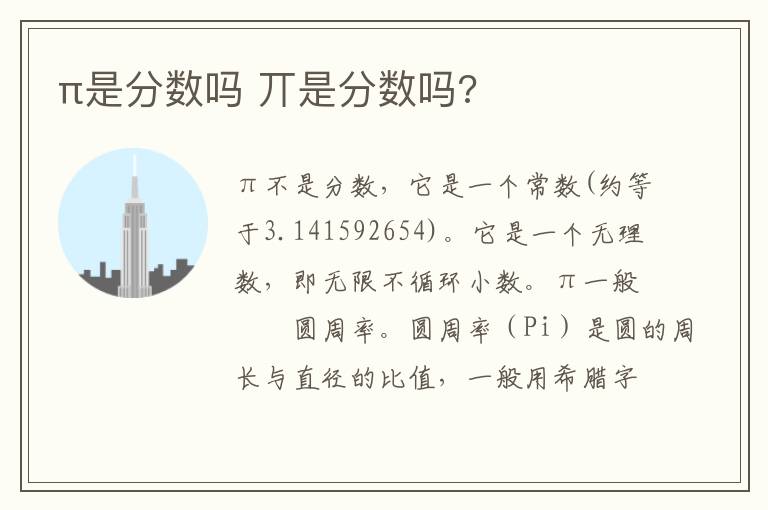 π不是分数,它是一个常数(约等于3.141592654)。它是一个无理数,即无限不循环小数。:π一般指圆周率。圆周率(Pi)是圆的周长与直径的比值,一般用希腊字母π表示,是一个在数学及物理学中普遍存在的数学常数。