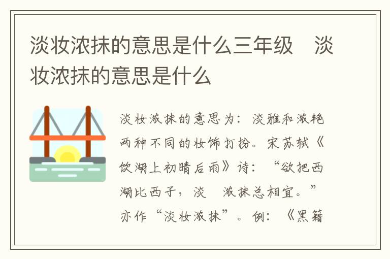 淡妆浓抹的意思为:淡雅和浓艳两种不同的妆饰打扮。宋苏轼《饮湖上初晴后雨》诗:“欲把西湖比西子,淡粧浓抹总相宜。”亦作“淡妆浓抹”。例:《黑籍冤魂》第十八回:“衣裳着得也俏,淡妆浓抹,总称他的高兴。”