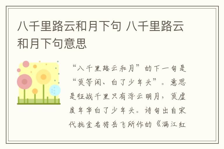 “八千里路云和月”的下一句是“莫等闲、白了少年头”。意思是征战千里只有浮云明月,莫虚度年华白了少年头。