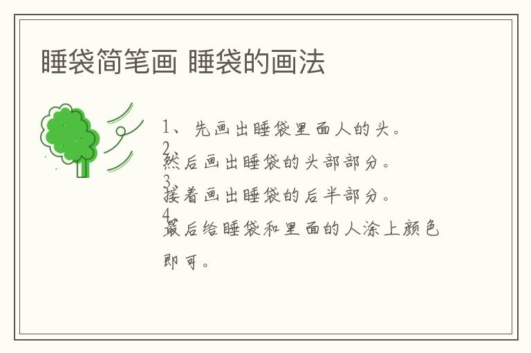 睡袋简笔画 睡袋的画法 知识分享 7月14日 编辑 童画 取消关注 关注 私信 1、先画出睡袋里面人的头。 2、然后画出睡袋的头部部分。 3、接着画出睡袋的后半部分。 4、最后给睡袋和里面的人涂上颜色即可。 No related posts. 本文内容由互联网用户自发贡献,该文观点仅代表作者本人。本站仅提供信息存储空间服务,不拥有所有权,不承担相关法律责任。如发现本站有涉嫌抄袭侵权/违法违规的内容, 请发送邮件至 2245678901@qq.com 举报,一经查实,本站将立刻删除。 给TA打赏 共{{data.count}}人 人已打赏