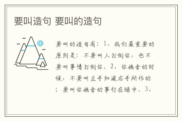要叫的造句有:1、我们最重要的原则是:不要叫人打倒你,也不要叫事情打倒你。2、你施舍的时候,不要叫左手知道右手所作的;要叫你施舍的事行在暗中。3、活的乡村教育要教人生利,他要叫荒山成林,叫瘠地长五谷。他教人人都能自立、自治、自卫。他要叫乡村变为西天乐园,村民都变为快乐的活神仙。