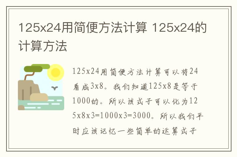 125x24用简便方法计算 125x24的计算方法 知识分享 7月14日 编辑 童画 取消关注 关注 私信 125x24用简便方法计算可以将24看成3x8。我们知道125x8是等于1000的。所以该式子可以化为125x8x3=1000x3=3000。所以我们平时应该记忆一些简单的运算式子。例如,25x4=100,125x8=1000等等。 No related posts. 本文内容由互联网用户自发贡献,该文观点仅代表作者本人。本站仅提供信息存储空间服务,不拥有所有权,不承担相关法律责任。如发现本站有涉嫌抄袭侵权/违法违规的内容, 请发送邮件至 2245678901@qq.com 举报,一经查实,本站将立刻删除。 给TA打赏 共{{data.count}}人 人已打赏