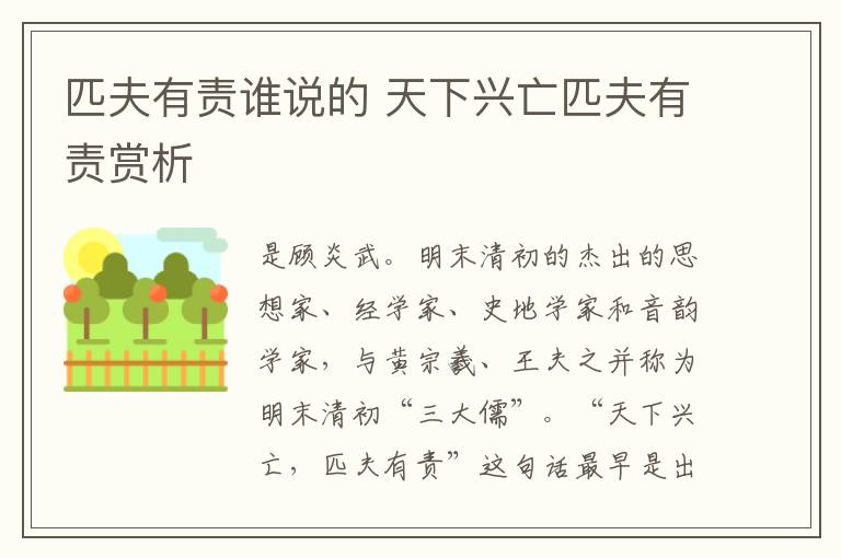 是顾炎武。明末清初的杰出的思想家、经学家、史地学家和音韵学家,与黄宗羲、王夫之并称为明末清初“三大儒”。“天下兴亡,匹夫有责”这句话最早是出现在顾炎武的《日知录·正始》中的概念,背景是清军入关。