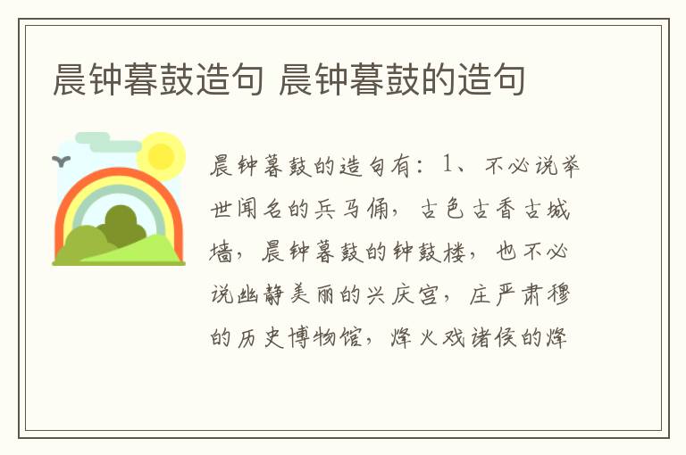 晨钟暮鼓的造句有:1、不必说举世闻名的兵马俑,古色古香古城墙,晨钟暮鼓的钟鼓楼,也不必说幽静美丽的兴庆宫,庄严肃穆的历史博物馆,烽火戏诸侯的烽火台,单是小小的碑林,就让我感慨万分。2、晨钟暮鼓常盈耳廉洁自律挂心中。3、古人云:“晨钟暮鼓,惊醒多少名利之客”。