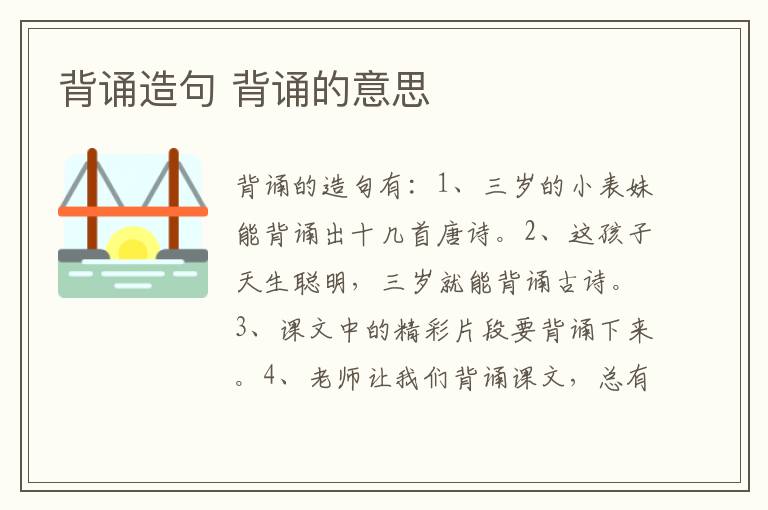 背诵的造句有:1、三岁的小表妹能背诵出十几首唐诗。2、这孩子天生聪明,三岁就能背诵古诗。3、课文中的精彩片段要背诵下来。4、老师让我们背诵课文,总有些同学滥竽充数。