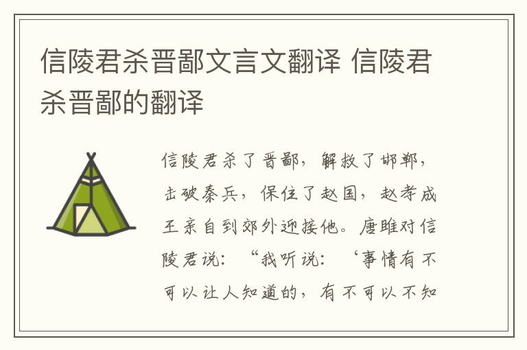 《信陵君杀晋鄙》的译文:信陵君杀了晋鄙,解救了邯郸,击破秦兵,保住了赵国,赵孝成王亲自到郊外迎接他。唐雎对信陵君说:“我听说:‘事情有不可以让人知道的,有不可以不知道的;有不可以忘记的,有不可以不忘记的。’”