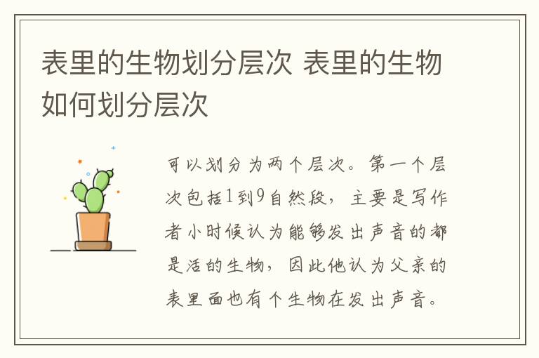 表里的生物划分层次 表里的生物如何划分层次 知识分享 8月6日 编辑 童画 取消关注 关注 私信 《表里的生物》可以划分为两个层次。 第一个层次包括1到9自然段,主要是写作者小时候认为能够发出声音的都是活的生物,因此他认为父亲的表里面也有个生物在发出声音。 第二个层次包括10到21自然段,主要写父亲打开表让作者看到了究竟,并告诉作者说表里面有个小蝎子。 No related posts. 本文内容由互联网用户自发贡献,该文观点仅代表作者本人。本站仅提供信息存储空间服务,不拥有所有权,不承担相关法律责任。如发现本站有涉嫌抄袭侵权/违法违规的内容, 请发送邮件至 2245678901@qq.com 举报,一经查实,本站将立刻删除。 给TA打赏 共{{data.count}}人 人已打赏