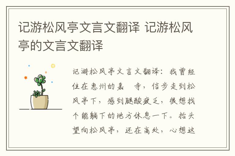 记游松风亭文言文翻译:我曾经住在惠州的嘉祐寺,信步走到松风亭下,感到腿酸疲乏,很想找个能躺下的地方休息一下。抬头望向松风亭,还在高处,心想这么高,我可如何爬上去休息呢?就这样想了一会儿,忽然对自己说:“这里为什么就不能休息呢?为何要到亭子里才能休息。”