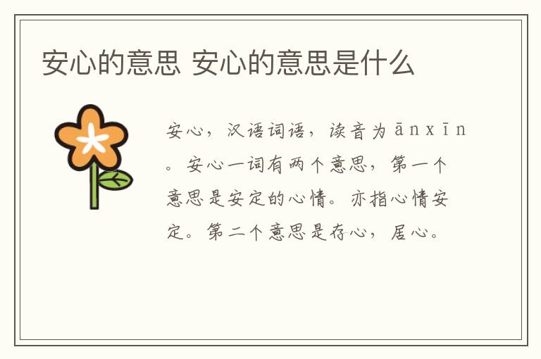 安心的意思 安心的意思是什么 知识分享 8月27日 编辑 童画 取消关注 关注 私信 安心,汉语词语,读音为ānxīn。安心一词有两个意思,第一个意思是安定的心情。亦指心情安定。第二个意思是存心,居心。词语出自《墨子·亲士》:“吾闻之曰:‘非无安居也,我无安心也。’” 安心的近义词有:宽心、宁神、放心、定心 反义词有:忘怀、苦恼、不安、忧虑 词语造句:家里一切都好,请爸爸安心工作,不必挂念。 No related posts. 本文内容由互联网用户自发贡献,该文观点仅代表作者本人。本站仅提供信息存储空间服务,不拥有所有权,不承担相关法律责任。如发现本站有涉嫌抄袭侵权/违法违规的内容, 请发送邮件至 2245678901@qq.com 举报,一经查实,本站将立刻删除。 给TA打赏 共{{data.count}}人 人已打赏