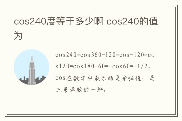 cos240=cos360-120=cos-120=cos120=cos180-60=-cos60=-1/2,cos在数学中表示的是余弦值,是三角函数的一种。