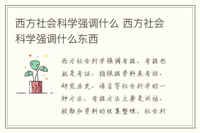 西方社会科学强调考据。考据也就是考证,指根据资料来考核、研究历史、语言等社会科学的一种方法。考据方法主要是训诂、校勘和资料的收集整理。社会科学指的是用科学的方法来研究人类社会的种种现象的各学科总体或其中任一学科。