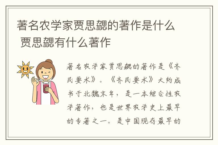 贾思勰的著作是《齐民要术》,《齐民要术》大约成书于北魏末年,是一本综合性农学著作,也是世界农学史上最早的专著之一,是中国现存最早的一部完整的农书。