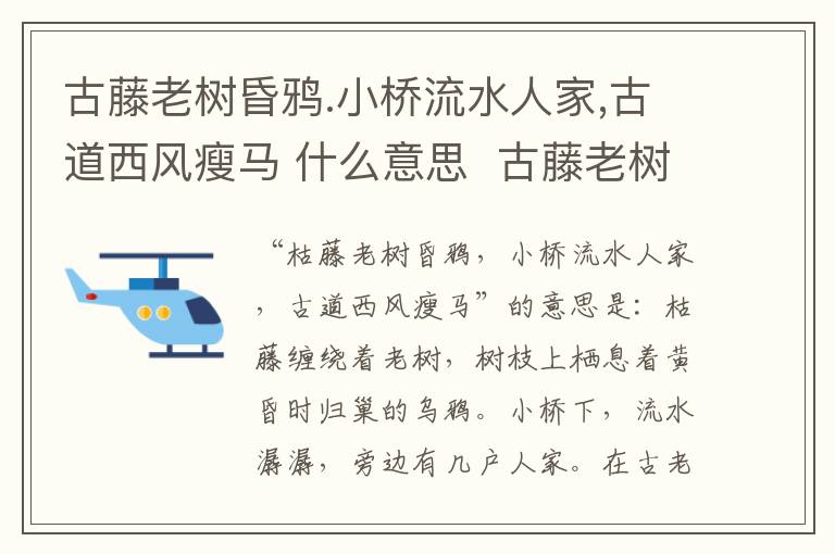 “枯藤老树昏鸦,小桥流水人家,古道西风瘦马”的意思是:枯藤缠绕着老树,树枝上栖息着黄昏时归巢的乌鸦。小桥下,流水潺潺,旁边有几户人家。在古老荒凉的道路上,秋风萧瑟,一匹疲惫的瘦马驮着我前行。该词出自于马致远的《天净沙·秋思》。原文是:“枯藤老树昏鸦,小桥流水人家。古道西风瘦马。夕阳西下,断肠人在天涯。”