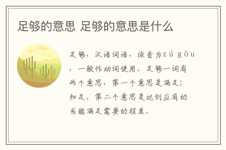 足够,汉语词语,读音为zú gòu,一般作动词使用。足够一词有两个意思,第一个意思是满足;知足。第二个意思是达到应有的或能满足需要的程度。词语出自元代陈草庵《山坡羊》曲:“生涯虽旧,衣食足够,区区自要寻生受。”
