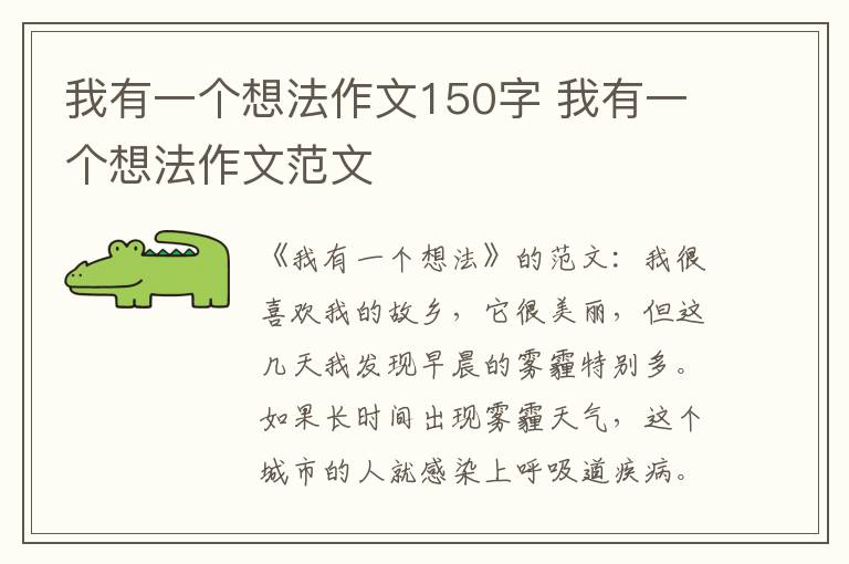 《我有一个想法》的范文:我很喜欢我的故乡,它很美丽,但这几天我发现早晨的雾霾特别多。如果长时间出现雾霾天气,这个城市的人就感染上呼吸道疾病。希望大家可以齐心协力,共同努力,让地球变得更干净,让天空变得更晴朗。