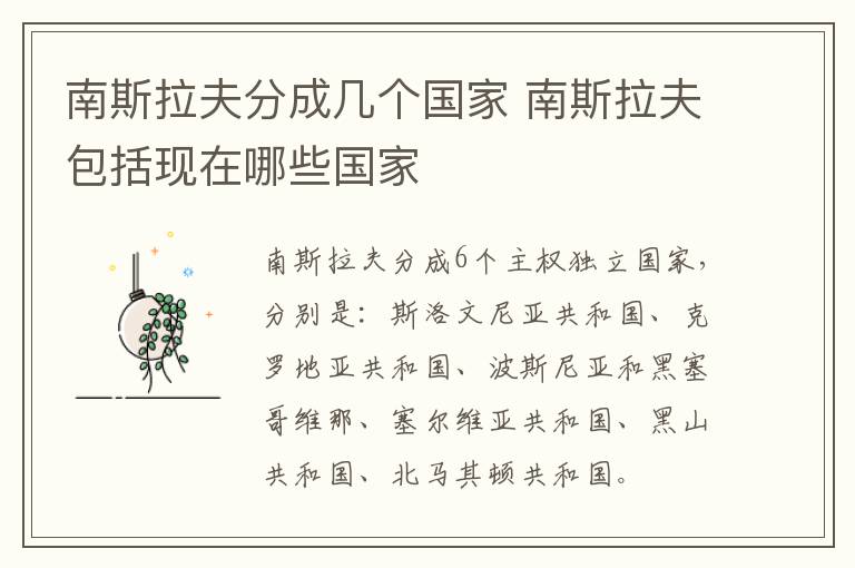 南斯拉夫分成6个主权独立国家,分别是:斯洛文尼亚共和国、克罗地亚共和国、波斯尼亚和黑塞哥维那、塞尔维亚共和国、黑山共和国、北马其顿共和国。
