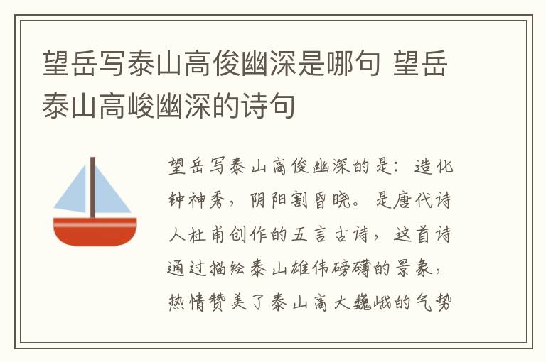 望岳写泰山高俊幽深的是:造化钟神秀,阴阳割昏晓。是唐代诗人杜甫创作的五言古诗,这首诗通过描绘泰山雄伟磅礴的景象,热情赞美了泰山高大巍峨的气势和神奇秀丽的景色。