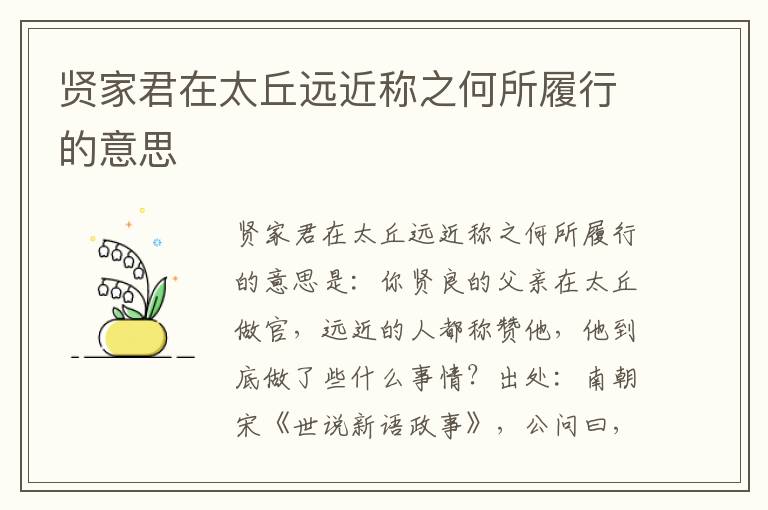 贤家君在太丘远近称之何所履行的意思是:你贤良的父亲在太丘做官,远近的人都称赞他,他到底做了些什么事情?出处:南朝宋《世说新语·政事》:“袁公问曰:‘贤家君在太丘,远近称之,何所履行?’元方曰:‘老父在太丘,强者绥之以德,弱者抚之以仁,恣其所安,久而益敬。’”