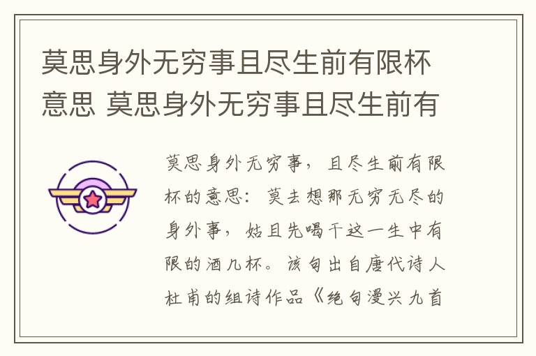 莫思身外无穷事,且尽生前有限杯的意思:莫去想那无穷无尽的身外事,姑且先喝干这一生中有限的酒几杯。该句出自唐代诗人杜甫的组诗作品《绝句漫兴九首》其四。这首诗写留春不住,只得及时行乐,其实这是无可奈何而自宽之词。