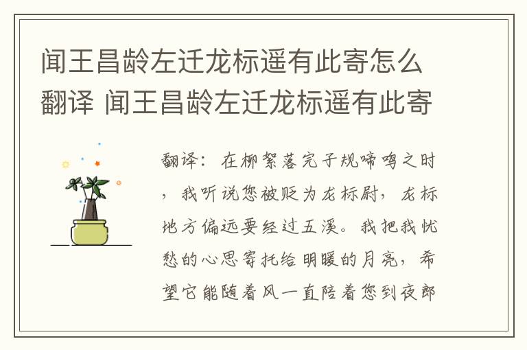 翻译:在柳絮落完子规啼鸣之时,我听说您被贬为龙标尉,龙标地方偏远要经过五溪。我把我忧愁的心思寄托给明暖的月亮,希望它能随着风一直陪着您到夜郎以西。《闻王昌龄左迁龙标遥有此寄》是唐代大诗人李白创作的一首诗。
