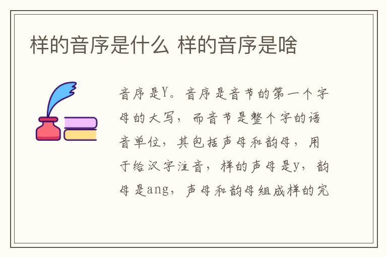 样的音序是什么 样的音序是啥 知识分享 9月14日 编辑 童画 取消关注 关注 私信 样的音序是Y。 音序是音节的第一个字母的大写,而音节是整个字的语音单位,其包括声母和韵母,用于给汉字注音,样的声母是y,韵母是ang,声母和韵母组成样的完整音节yang,又由于音节yang的第一个字母的大写是Y。所以,样的音序是Y。 No related posts. 本文内容由互联网用户自发贡献,该文观点仅代表作者本人。本站仅提供信息存储空间服务,不拥有所有权,不承担相关法律责任。如发现本站有涉嫌抄袭侵权/违法违规的内容, 请发送邮件至 2245678901@qq.com 举报,一经查实,本站将立刻删除。 给TA打赏 共{{data.count}}人 人已打赏