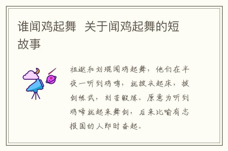 祖逖和刘琨闻鸡起舞,他们在半夜一听到鸡鸣,就披衣起床,拔剑练武,刻苦锻炼。原意为听到鸡啼就起来舞剑,后来比喻有志报国的人即时奋起。