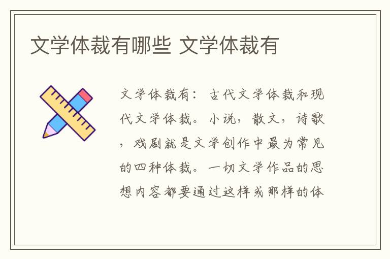 文学体裁有:古代文学体裁和现代文学体裁。小说,散文,诗歌,戏剧就是文学创作中最为常见的四种体裁。一切文学作品的思想内容都要通过这样或那样的体裁来表现,没有体裁的文学作品是不存在的。这犹如人们做衣服,必定要量体裁衣,选择一定的样式。在文学发展的历史上,出现了多种多样的文学体裁。这些名目繁多的文学体裁的产生和演变,都有一定的社会根据和它本身的发展规律。
